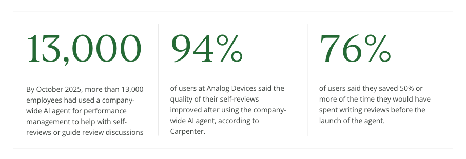 Fast forward a year, and Carpenter was using ChatGPT to build a writing agent prototype for a test case of leaders. Then a year after that—by last October—she had released a company-wide agent that more than 13,000 people at Analog Devices have used to help write their self-reviews or guide their review discussions. Some 94% of users said the quality of their self-reviews improved, and 76% said they saved 50% or more of the time they would have spent writing.
